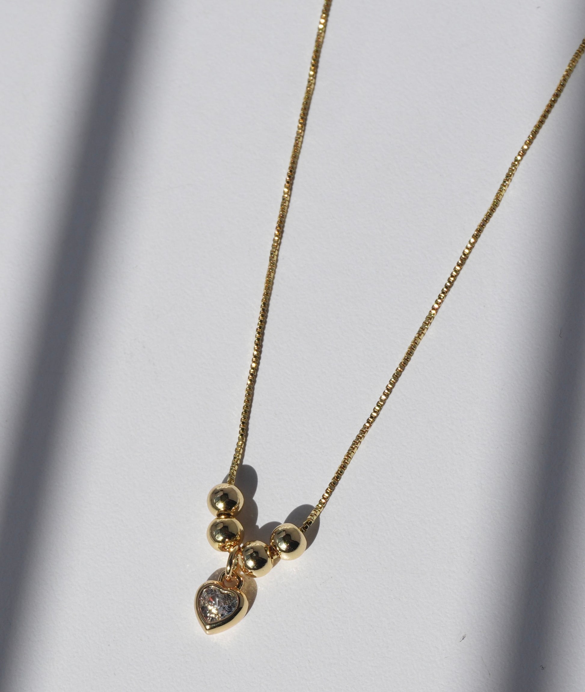 El protagonista indiscutible es su exquisito diseño central: un deslumbrante cristal translúcido en forma de corazón, facetado para capturar la luz de manera magistral. Este destello cristalino está delicadamente acompañado por una secuencia de esferas doradas perfectamente pulidas, creando un balance visual de pura sofisticación.